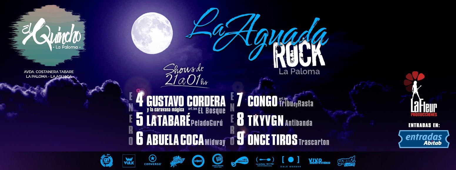 La Aguada Rock, el primer ciclo de recitales del año, uno de los eventos musicales más grandes de este 2016. Del 4 al 9 de enero 12 shows tendrán lugar en la Avenida Costanera Tabaré de La Paloma, playa La Aguada.