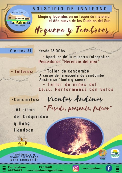 El Centro Cultural de La Paloma de invita a celebrar el solsticio de invierno con hoguera y tambores. Magia y leyendas en un fogón de invierno, el año nuevo de los pueblos del sur.