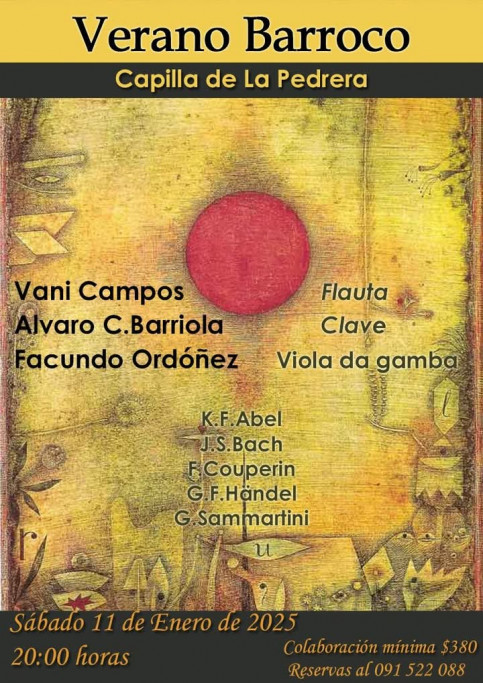 Verano Barroco en Capilla de La Pedrera con música en vivo. Participan: Vani Campos Álvaro C. Barriola Facundo Ordóñez Reservas al 091 522 088.