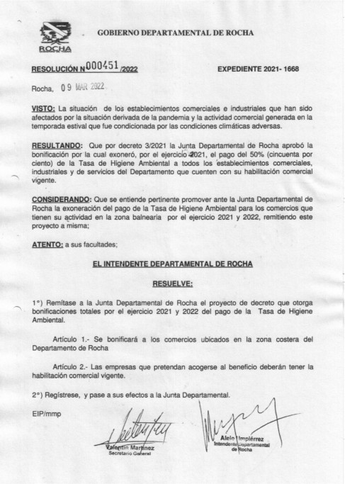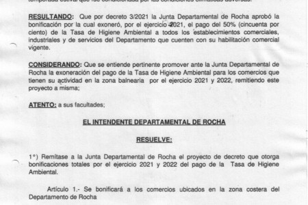 Ante las gestiones realizadas por la Corporación Rochense de Turismo (CRT), frente a la situación de los establecimientos comerciales e industriales que han sido afectados por la situación derivada de la pandemia y la actividad comercial generada en la temporada estival que fue condicionada por condiciones climáticas, se exonerará la tasa de higiene 2021 / 2022 a operadores turísticos de zonas balnearias del departamento.